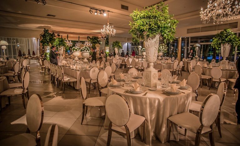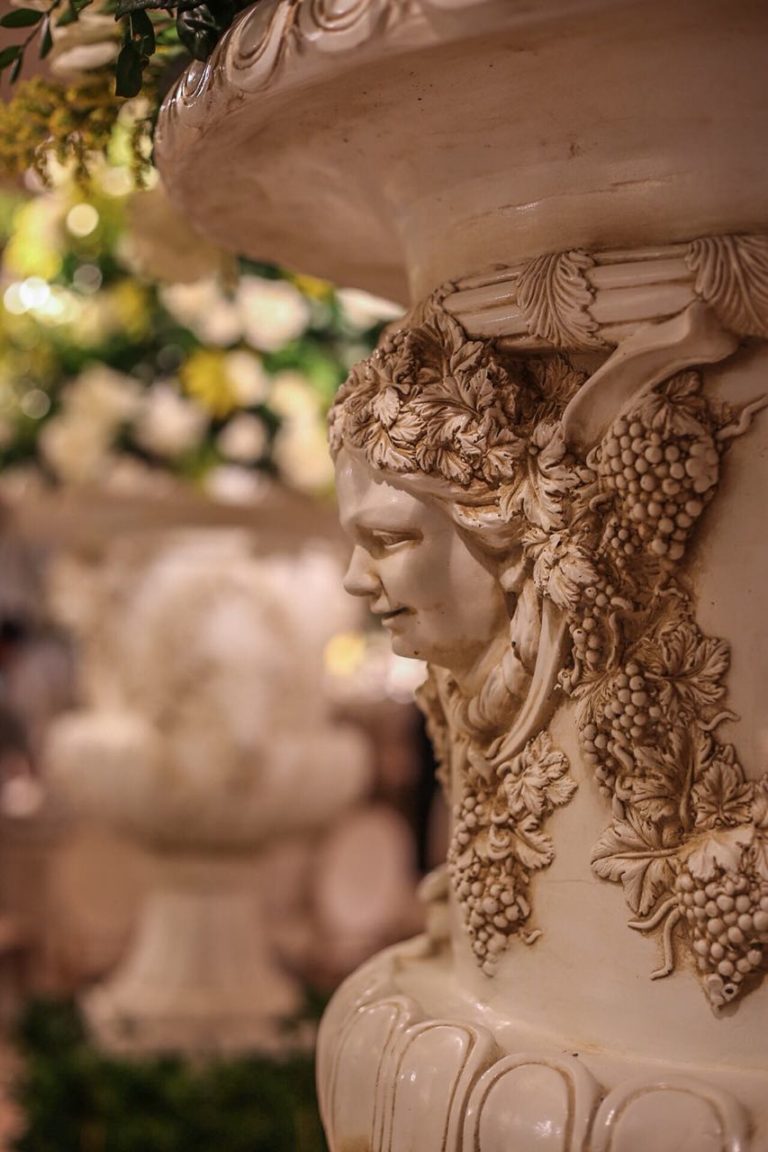 La iluminación teatral focaliza los detalles del mármol antiguo tallado generando una experiencia diferente para un Bridal Style con actitud, delicadeza y mucho amor.