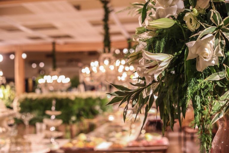 La selección de flores íntegramente en blanco genera mayor suavidad con detalles de caídas y sinuosidad en la follajeria.