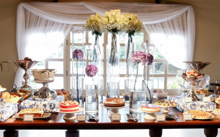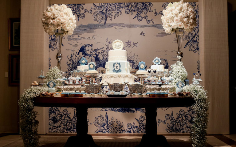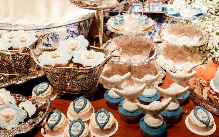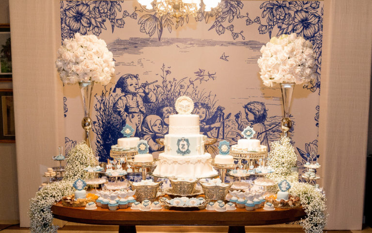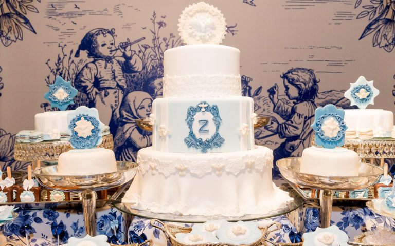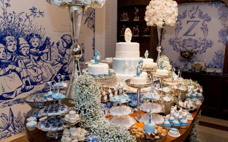 La mesa principal de dulces fue diseñada exclusivamente para Zahir, con un mosaico en toile representando una escena de los pastorcitos con el Espíritu Santo, así también un mismo detalle en la torta con todos sus complementos.